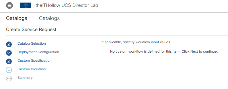 Again, depending upon how you setup the policies in the VDC, you may be able to select a post-deployment workflow to be executed after the VM is provisioned. Click “Next”.