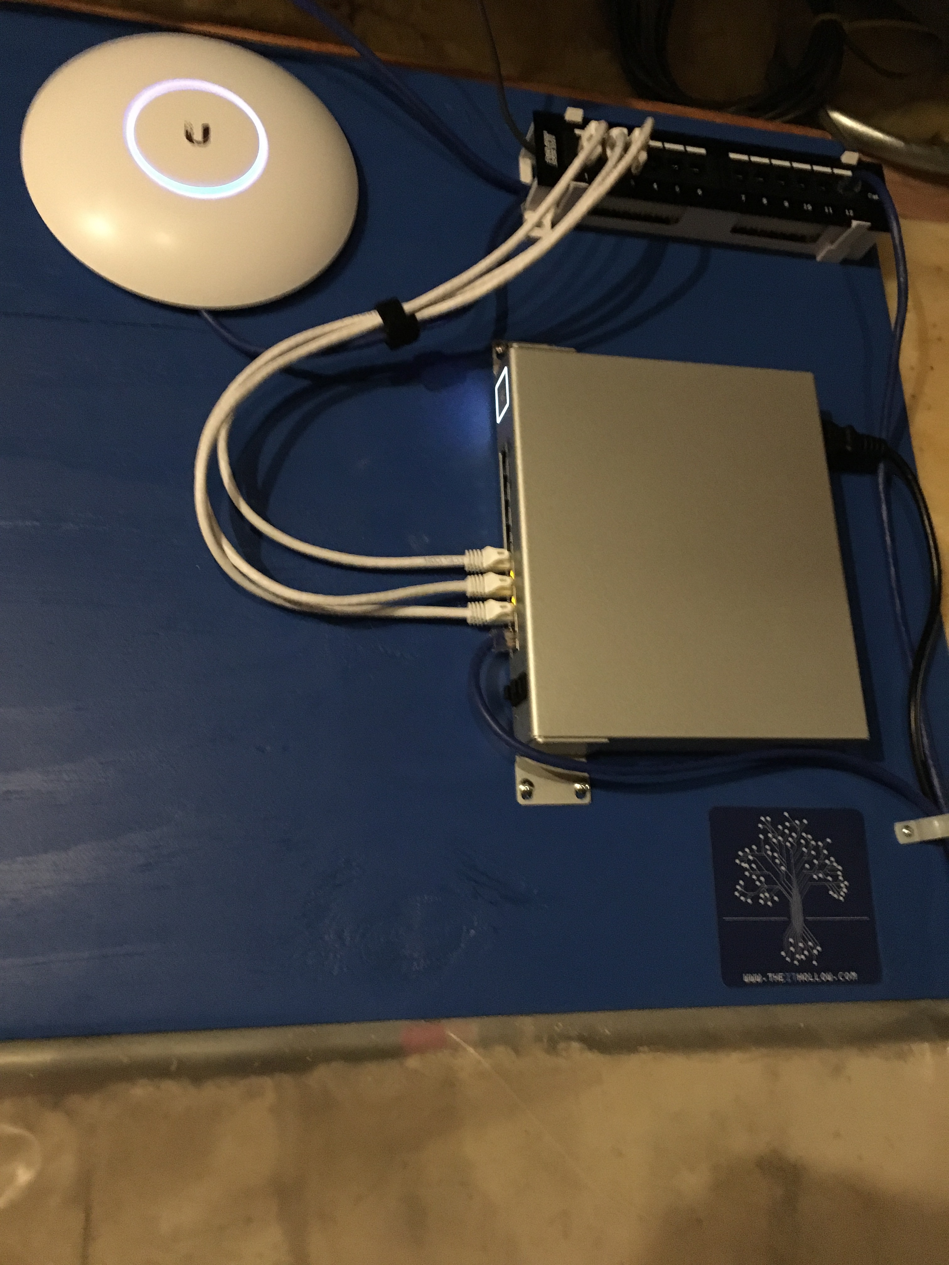 I bought a pair of the Ubiquiti UAP AC Pro access points and ran some cabling. I wanted to make sure that the entire house is covered so I placed one access point in the basement and another in the upstairs bedroom, on opposite sides of the house. Then I ran cat 6 cabling to the access points and connected them to a new Ubiquiti UniFi 8 POE-150W switch so I could power the APs over ethernet instead of having to have a power cable for each access point. I mounted my basement access point, patch panel and Ubiquiti UniFi switch to a piece of plywood and screwed it to the wall.