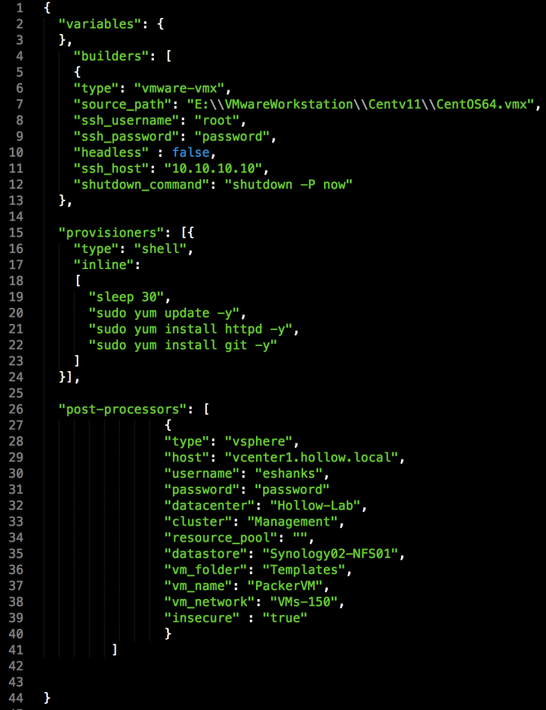 Packer gives us a great way to do this. The tool takes a JSON file and builds a new image based on the information contained within. This allows us to move our template patching and updating processes as a piece of code that can be stored in a version control repository like git. Now our builds are deployed in a repeatable fashion and we know that each month when our images are updated, that they’ll be consistent and the same across our organization. It’s pretty awesome to be able to use a file like the one below to build all of your images across your infrastructure.