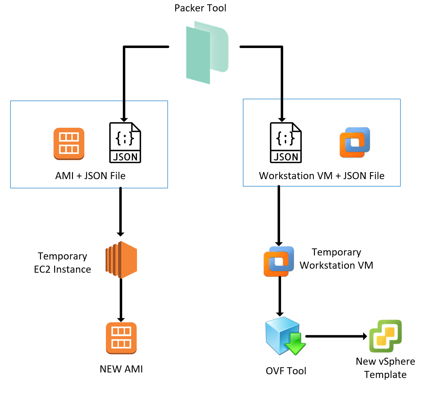 AWS images update pretty straight forward by cloning an existing Amazon Machine Image (AMI), updating it and creating a new AMI from a new machine. The vSphere process can be a bit different. For example, A VMware Workstation VM can be cloned, updated and then exported to vSphere through the OVFtool. This process is slightly different but achieves the same effect. The diagram below demonstrates how the processes look.