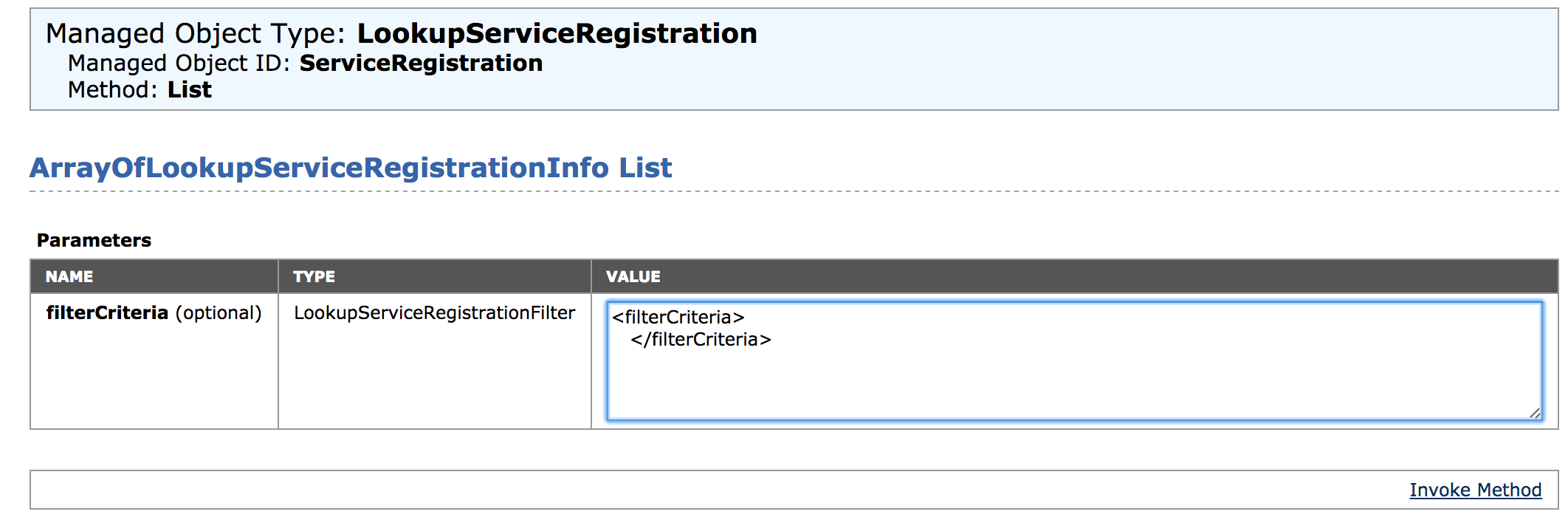 Once you’ve logged in, you’ll want to modify the information in the “Value” box so that it only contains the filterCriteria tags like the screenshot below. When you’ve removed the other tag information in that window click “Invoke Method”