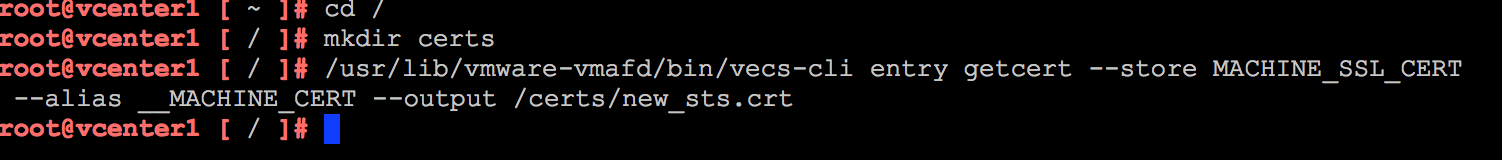 /usr/lib/vmware-vmafd/bin/vecs-cli entry getcert –store MACHINE_SSL_CERT –alias __MACHINE_CERT –output /certs/new_sts.crt