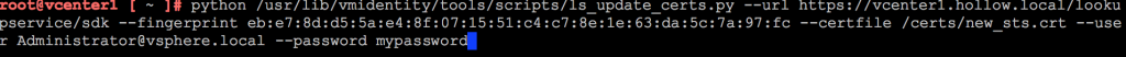 python /usr/lib/vmidentity/tools/scripts/ls_update_certs.py –url VCENTERLOOKUPURL –fingerprint FINGERPRINTFROM_OLD.FPRINT.TXT –certfile /certs/new_sts.crt –user [email protected] –password YOURPASSWORD