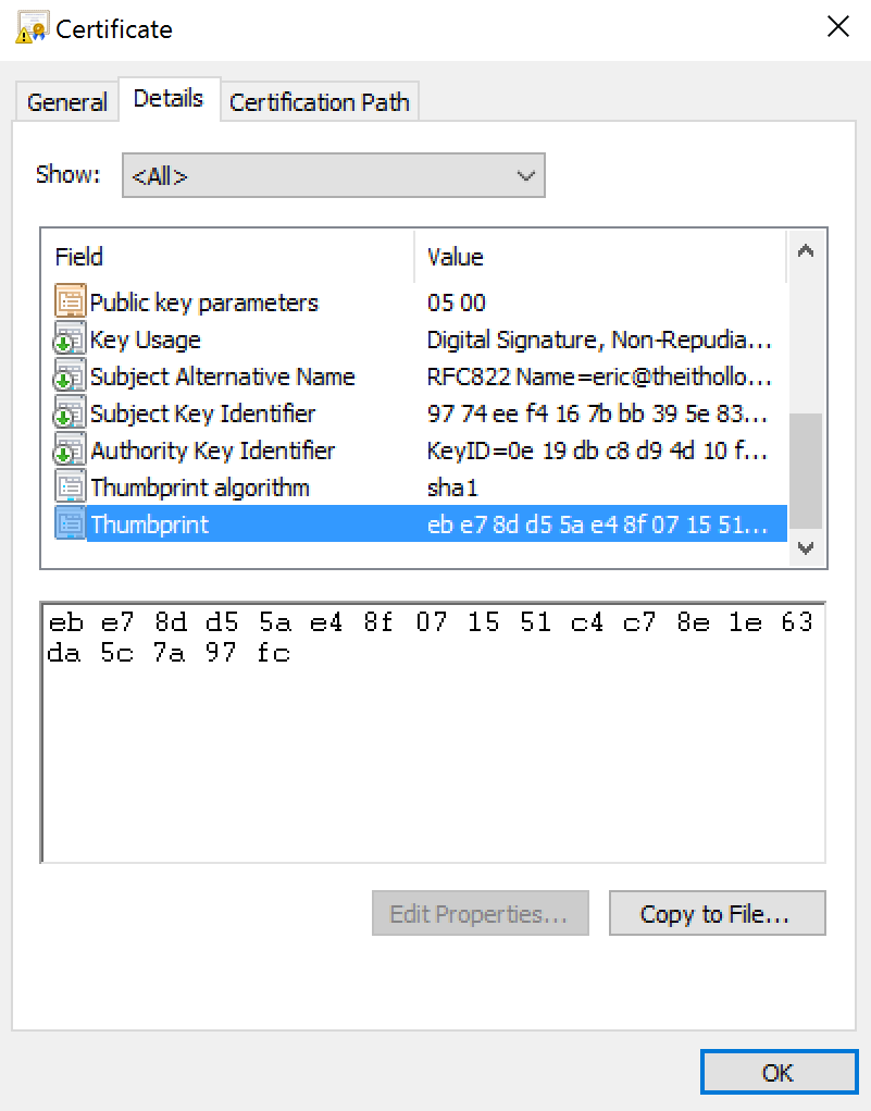 Now open the sts.cer file with certmgr.exe on a windows machine or similar program. Find the fingerprint by going to the details tab and looking for the “Thumbprint” attributes. Copy the thumbprint value into your clipboard.