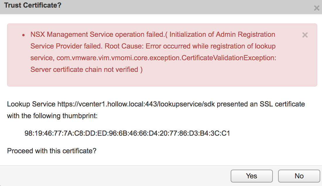 When I tried to connect my NSX Manager to my vCenter I’d get an error stating that the certificate change was not verified, like the following:
