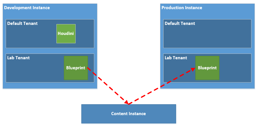 You could set this up in a few ways but we’ll keep this pretty simple for a starting point. Houdini needs a few things. For our scenario we’ll have two separate vRA instances, development and production and we’ll deploy a third vRA appliance (No IAAS Serves required) to serve as a remote content server which will cache our blueprints. These remote content servers can be used when passing artifacts over the WAN or between security zones can be an issue.