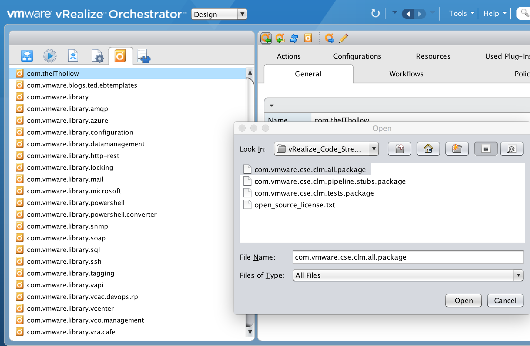 Houdini gets installed from vRealize Orchestrator and not as a windows installer package or OVA file or something. Download the vRealize Code Stream Management Pack for IT DevOps Package from the VMware product downloads page. Once done, open your vRealize Orchestrator console and change to the design view. Switch over to the packages tab and click the import button. Find the com.vmware.cse.clm.all.package file that you’ve downloaded from the VMware product page.
