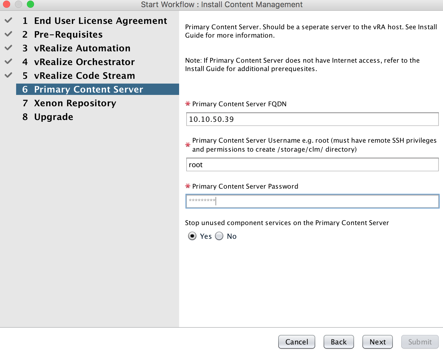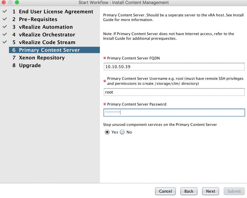 Now we need to enter in the root username/password for our vRA content server which is just a simple vRA deploment. We didn’t even need the IaaS servers installed for that one. You can select “stop unused component services on the Primary Content Server” so that unnecessary services can be stopped.