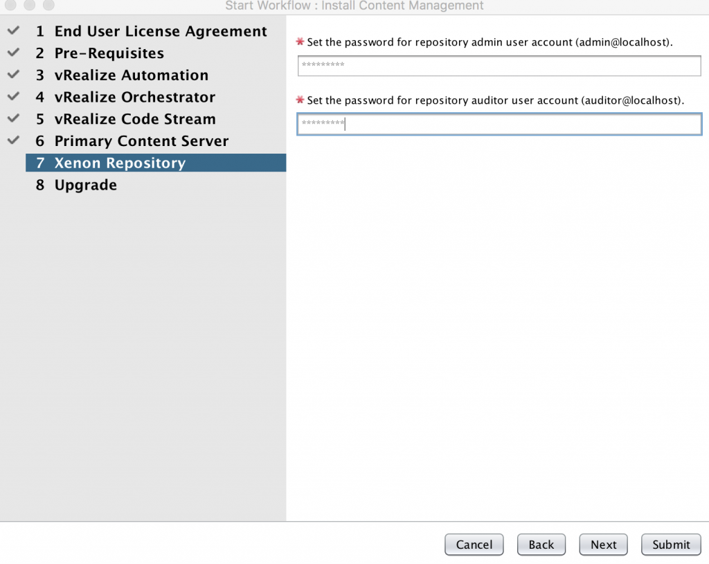 Enter in a password to be used for a repository admin account and a repository auditor account for the Xeon repository. This is where content will be cached on the content repository.