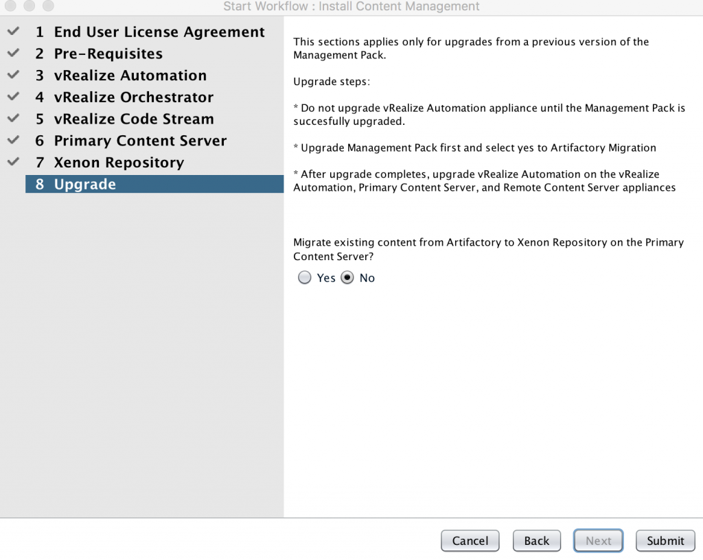 You can also move your artifactory content to the Xenon repository if you wish, but I’ve decided to skip this step. Click Submit to kick off the workflow.