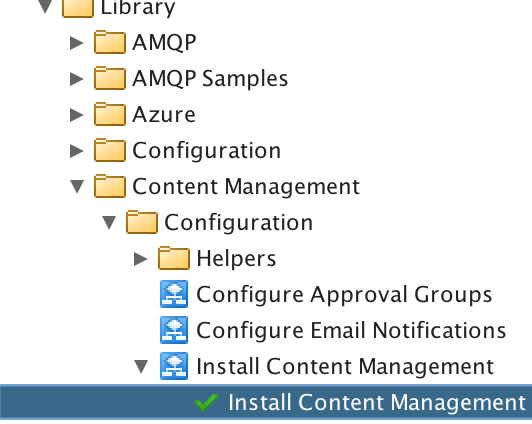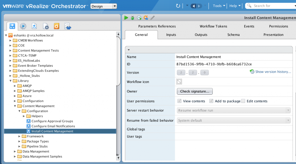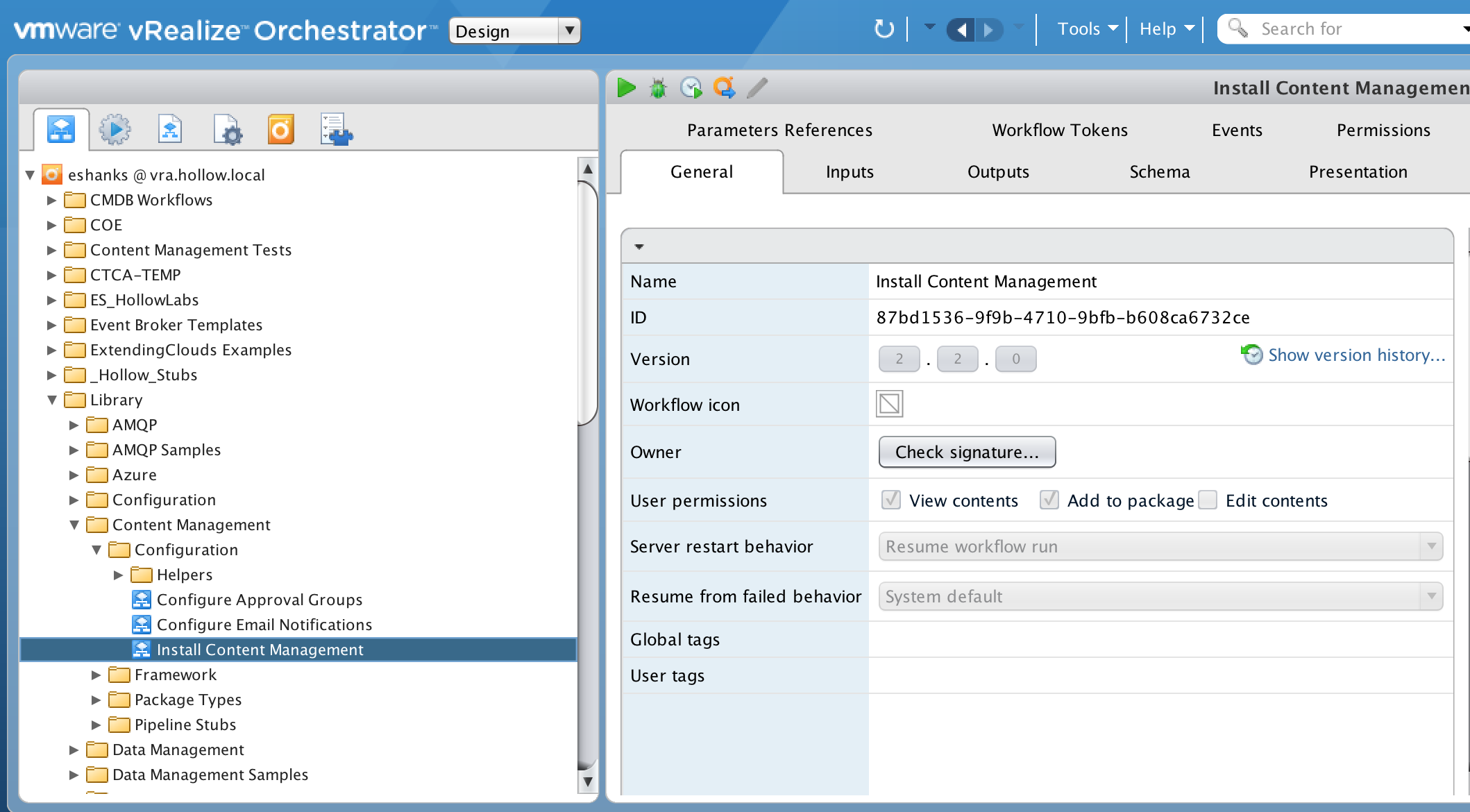 Once your package has been imported, you can begin some of the configuration with vRealize Automation. This configuration is done by running one of those shiny new vRO workflows that got imported as part of the packages. Navigate to Library –> Content Management –> Configuration –> Install Content Management. Run the workflow.