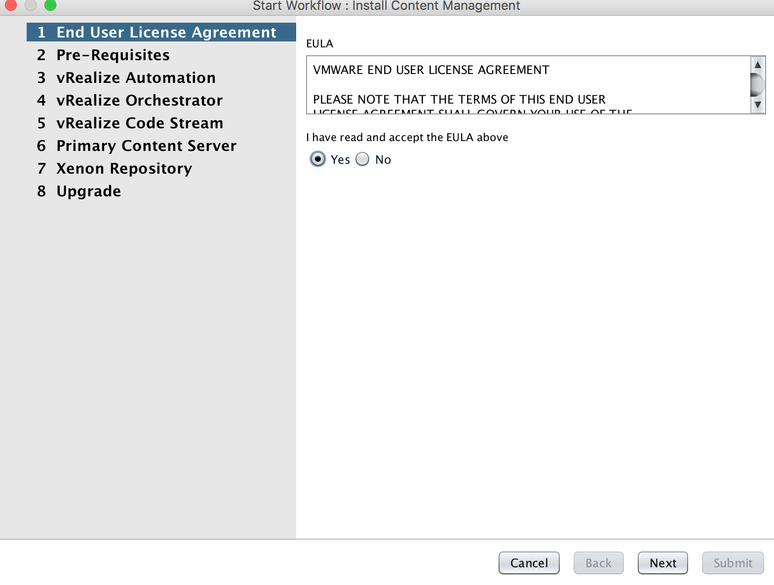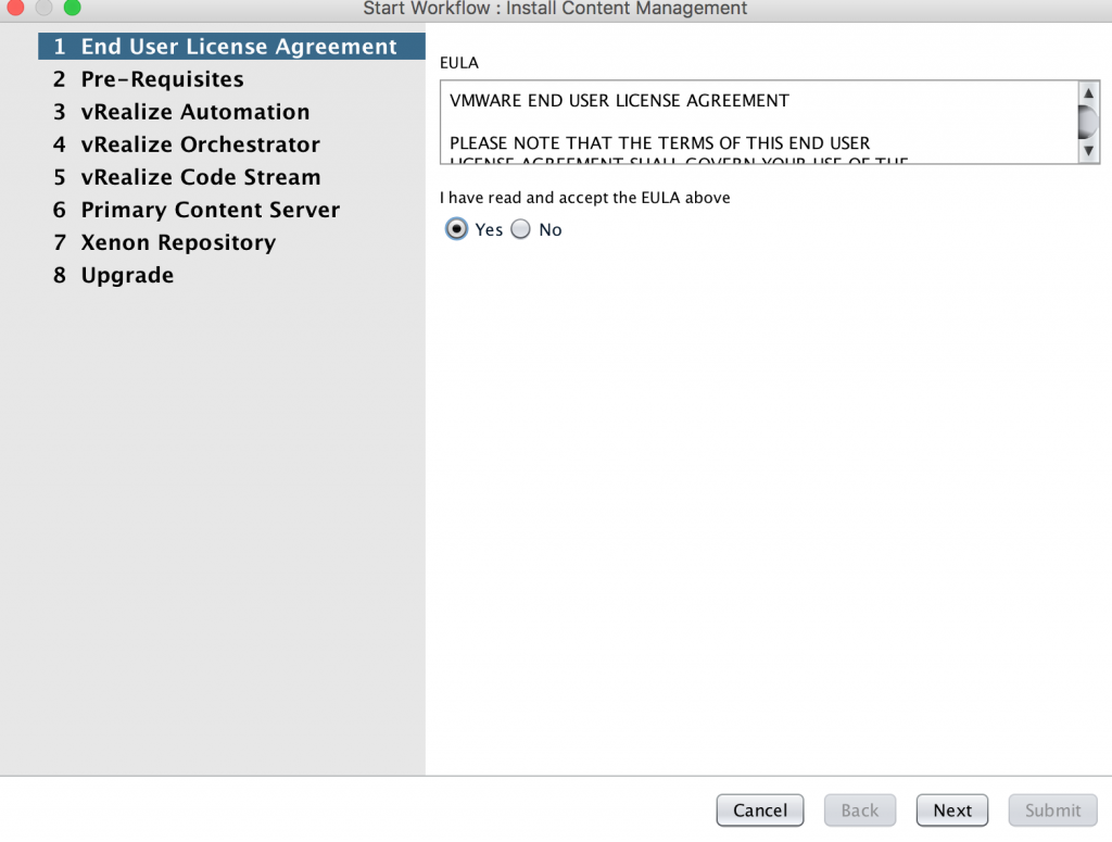 On the first screen of the workflow, accept (after thoroughly reading) the EULA and then click “Next”.