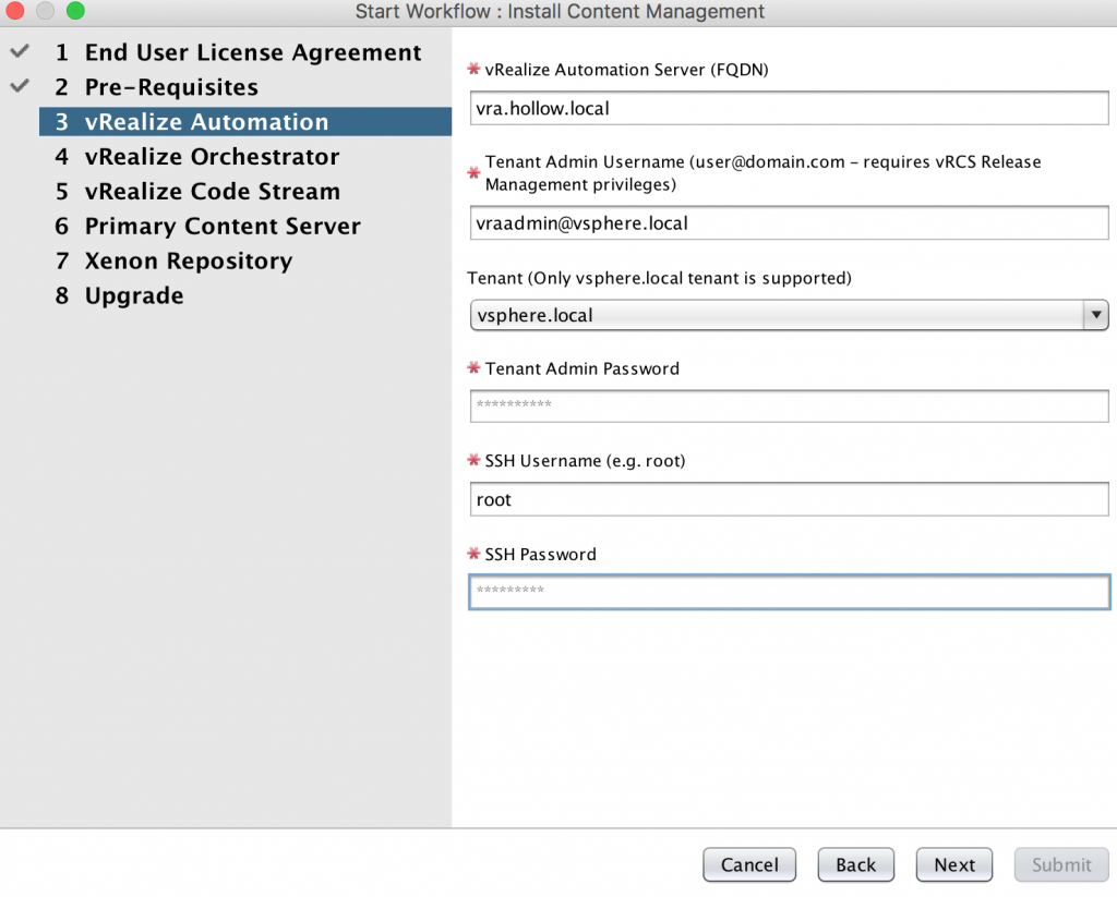 On the next screen we need to enter in our vRealize Automation information that will house our Houdini blueprints. I’ve selected my development instance. Fill in the vRA FQDN, tenant admin user, password and SSH username and password of the vRA appliance. Also be sure to select the tenant which will need to be the default tenant “vsphere.local”.
