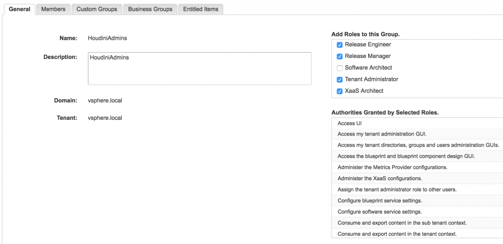 Before we click those install buttons, we’ll need to ensure that our default tenant is in tip top shape. We’ll need a vRealize Code Stream license applied since vRCS is the major mechanism used by Houdini. After this, we’ll need to ensure that we have a user with the appropriate permissions on the default tenant to operate Code Stream. Be sure that your Houdini user has the following roles:
