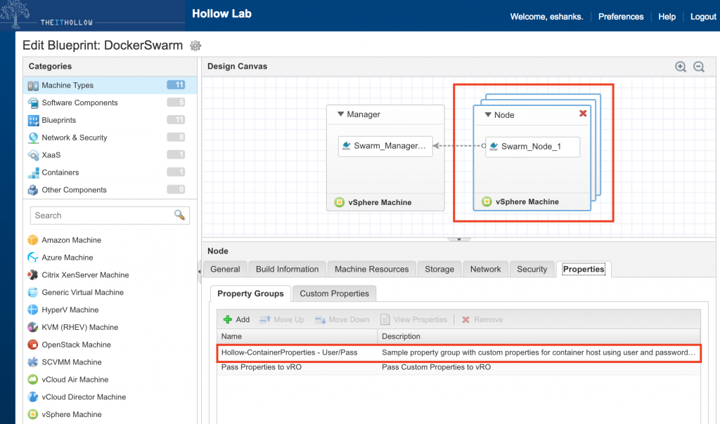 You can see that I modified Ryan’s blueprint to add both my new container property group as well as one to pass some info over to vRO for DNS purposes. That one is not necessary for containers, but nice if you’ve got any event subscriptions that run during deployment like I do. (Adding to DNS is particularly useful). Also note, that I’ve only added the property group to the “Swarm Node” machines and not the manager, even though you could add it as a container host as well.