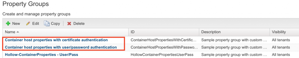 The thing to note here is that vRA will automatically detect container hosts and add them to the inventory if one of the built in-property groups is used with the blueprint. The screenshot below shows the default property groups that came with vRA 7.2 and you’ll notice a third property group that I’m using which is a copy of the “Container host properties with user/password authentiation”. I like to copy the build in stuff before I make any modifications to them.