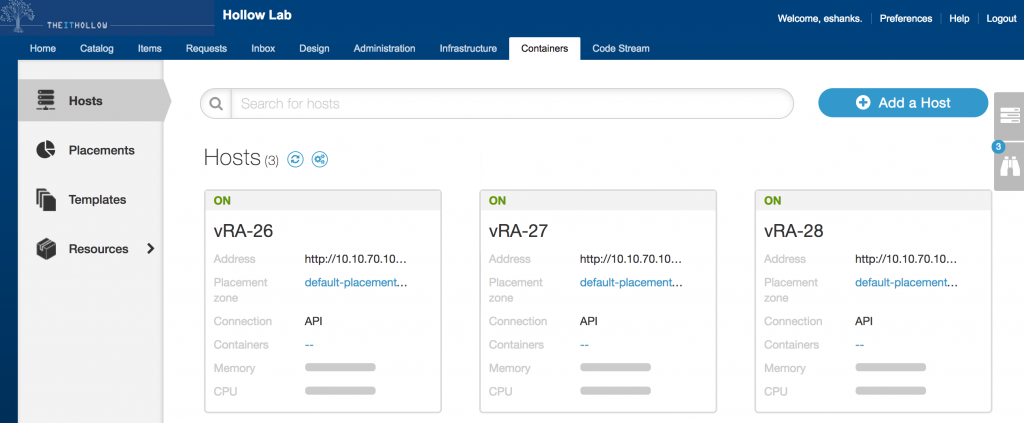Once your catalog item has been requested, you can take a look in the “Containers” tab and you’ll see your container hosts listed there. I’ve deployed three in this example.
