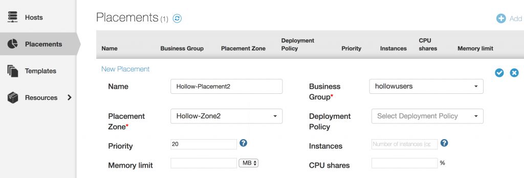 Placements are used in much the same way a reservation is used with deploying virtual machines through vRA. Placements carve up the resources on a container and set limits on how many resources can be used. For instance, you might only allow 5 GB of memory to be used out of a container host that has 6 GB of memory. This would leave you memory for the host operating system to use.