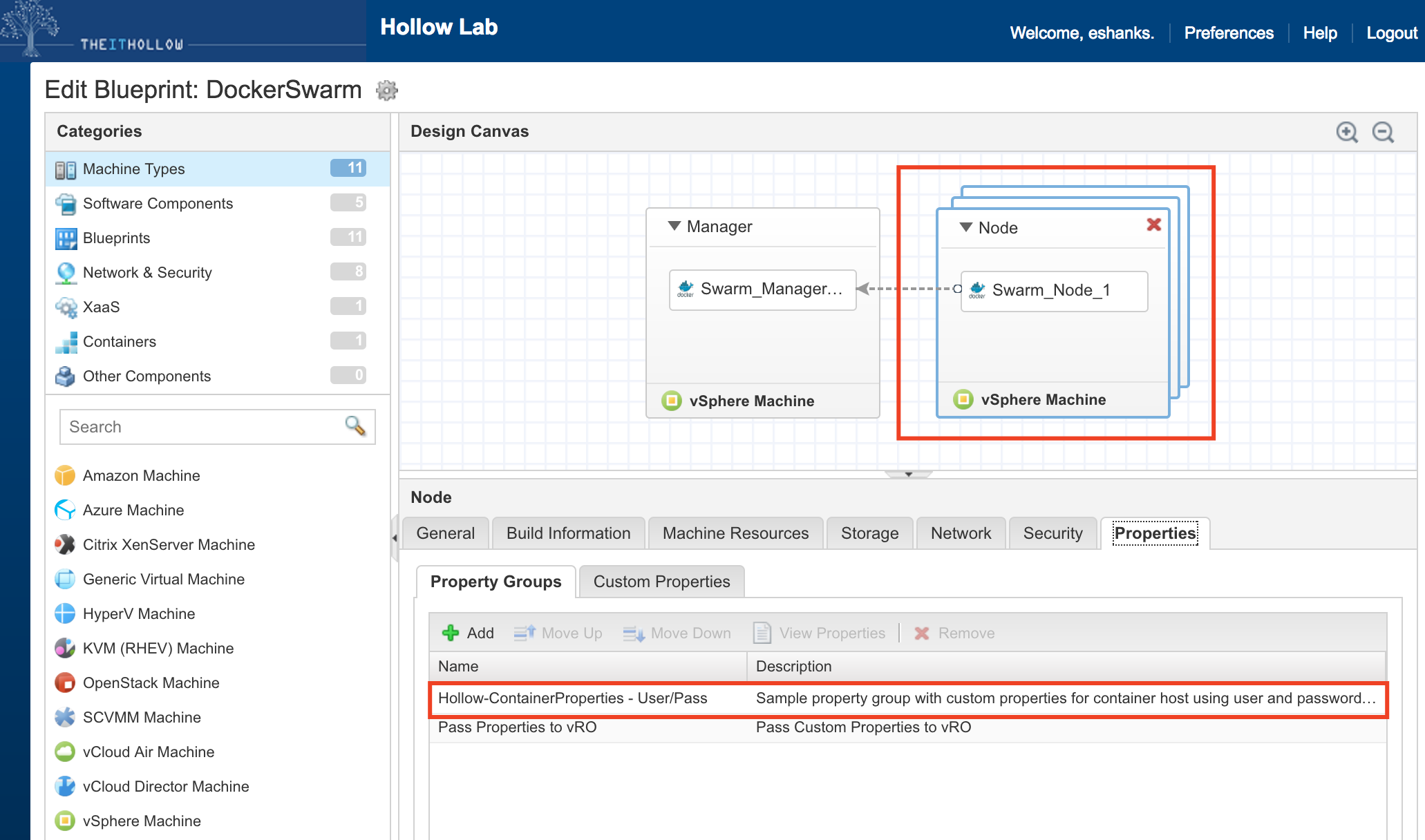 You can see that I modified Ryan’s blueprint to add both my new container property group as well as one to pass some info over to vRO for DNS purposes. That one is not necessary for containers, but nice if you’ve got any event subscriptions that run during deployment like I do. (Adding to DNS is particularly useful). Also note, that I’ve only added the property group to the “Swarm Node” machines and not the manager, even though you could add it as a container host as well.