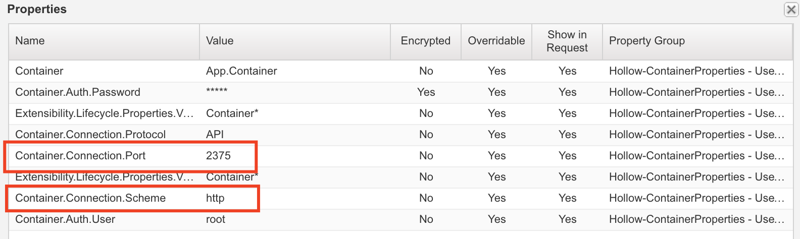 Here are the changes to the Containers property group that I made from the default settings. The connection port is 2375 and the scheme is http. The default property group assumes you’re doing things property and using an encrypted https connection over port 2376. Yeah, I cheated, but this is why I made a copy of the default property groups and modified them.