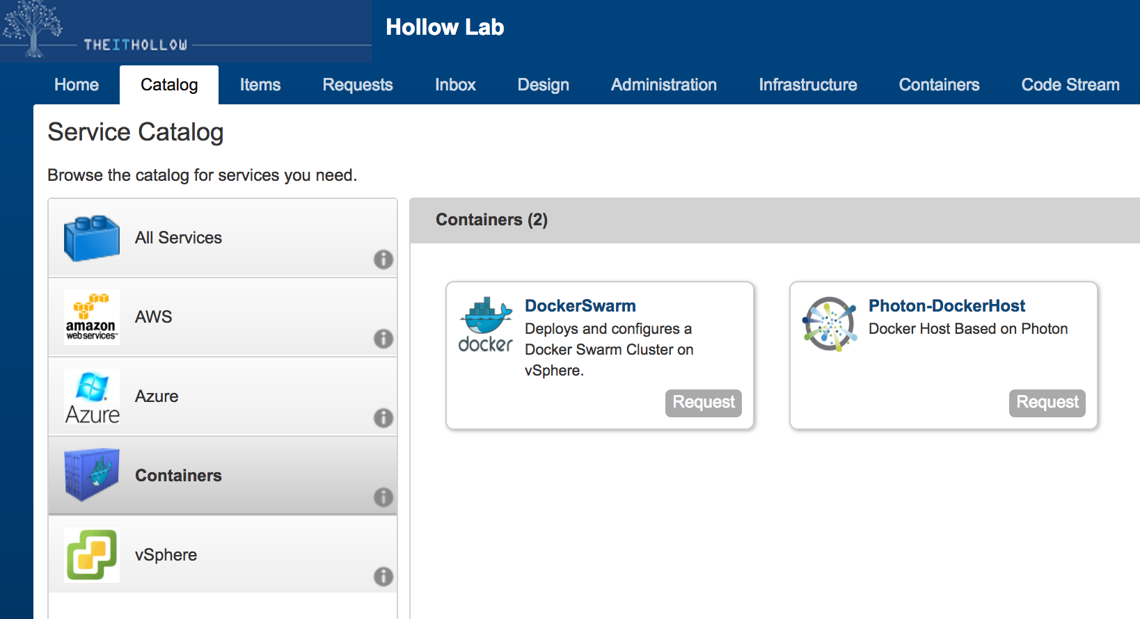 Version 7.2 of vRealize Automation introduced containers to the vRA solution. This post is designed to get you up and running with some basic containers and give you the tools needed to deploy some of your own containers in your environment.