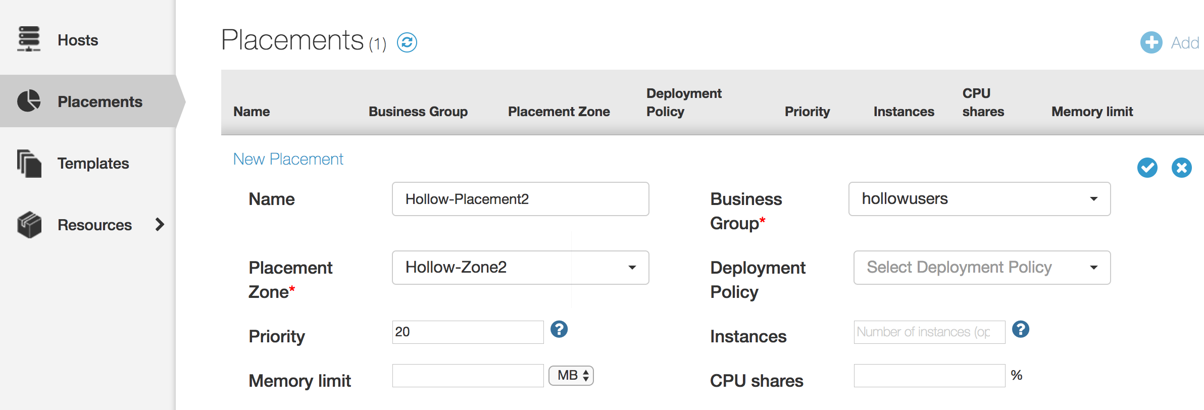 Under the “Placements” menu in the “Containers” tab, click the plus sign to add a new placement. Give it a name, and either select the default placement zone or create your own. Then set a priority (lower number means higher priority) and assign the business group. If you’d like, you may assign it some limits, or by default, the entire container host is available to be used.