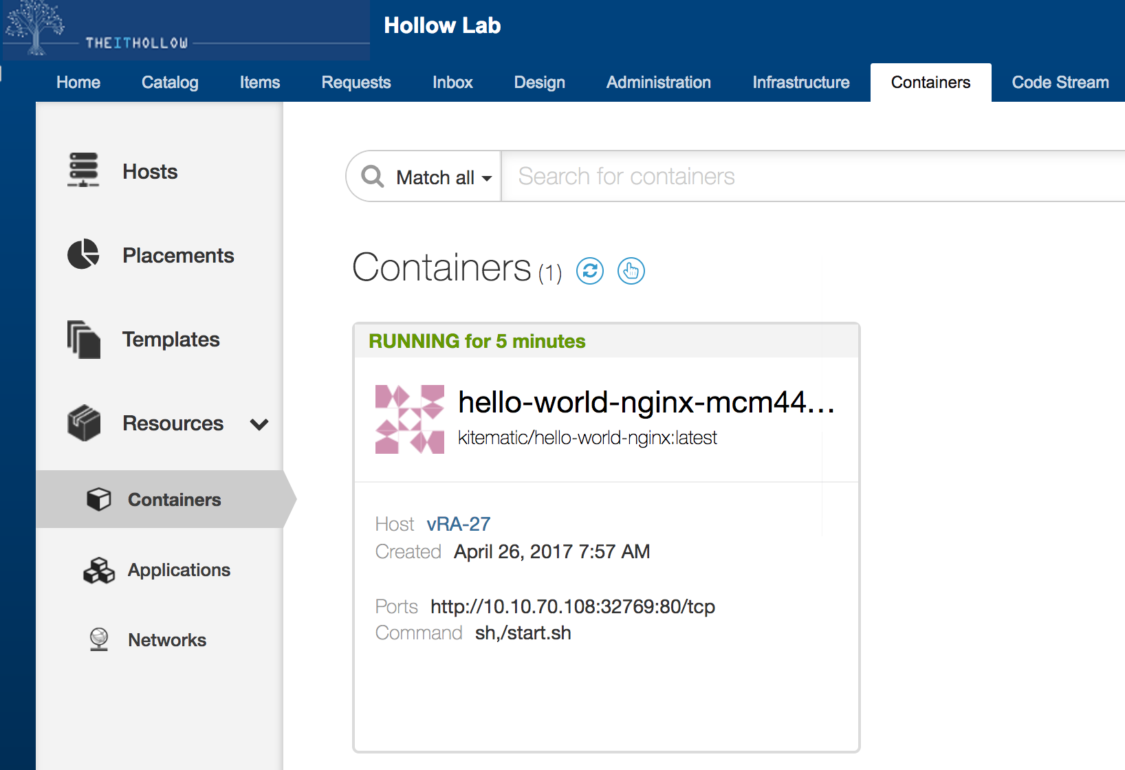 Once your catalog item has been requested, you can take a look in the “Containers” tab and you’ll see your container hosts listed there. I’ve deployed three in this example.