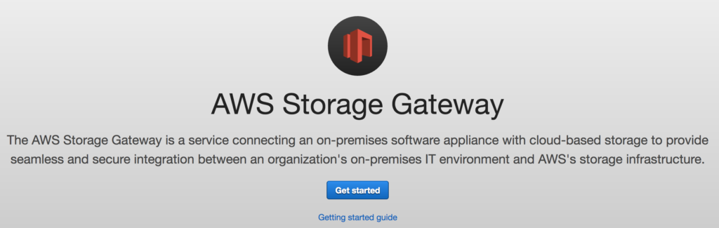 Now we’re ready to get started with the storage gateway. Go to the AWS console and open the Storage Gateway service. Since this is the first time we’ve used it, click the “Get started” button.