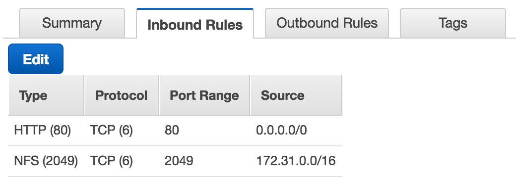 Next up, we want to create a security group that will be used to filter the traffic to our storage gateway. I’ll be using two rules. The first is to allow HTTP traffic to the storage gateway. This port is used to activate the gateway. The second rule is to allow NFS access to the gateway and I’ll restrict that access to only machines from within my VPC.