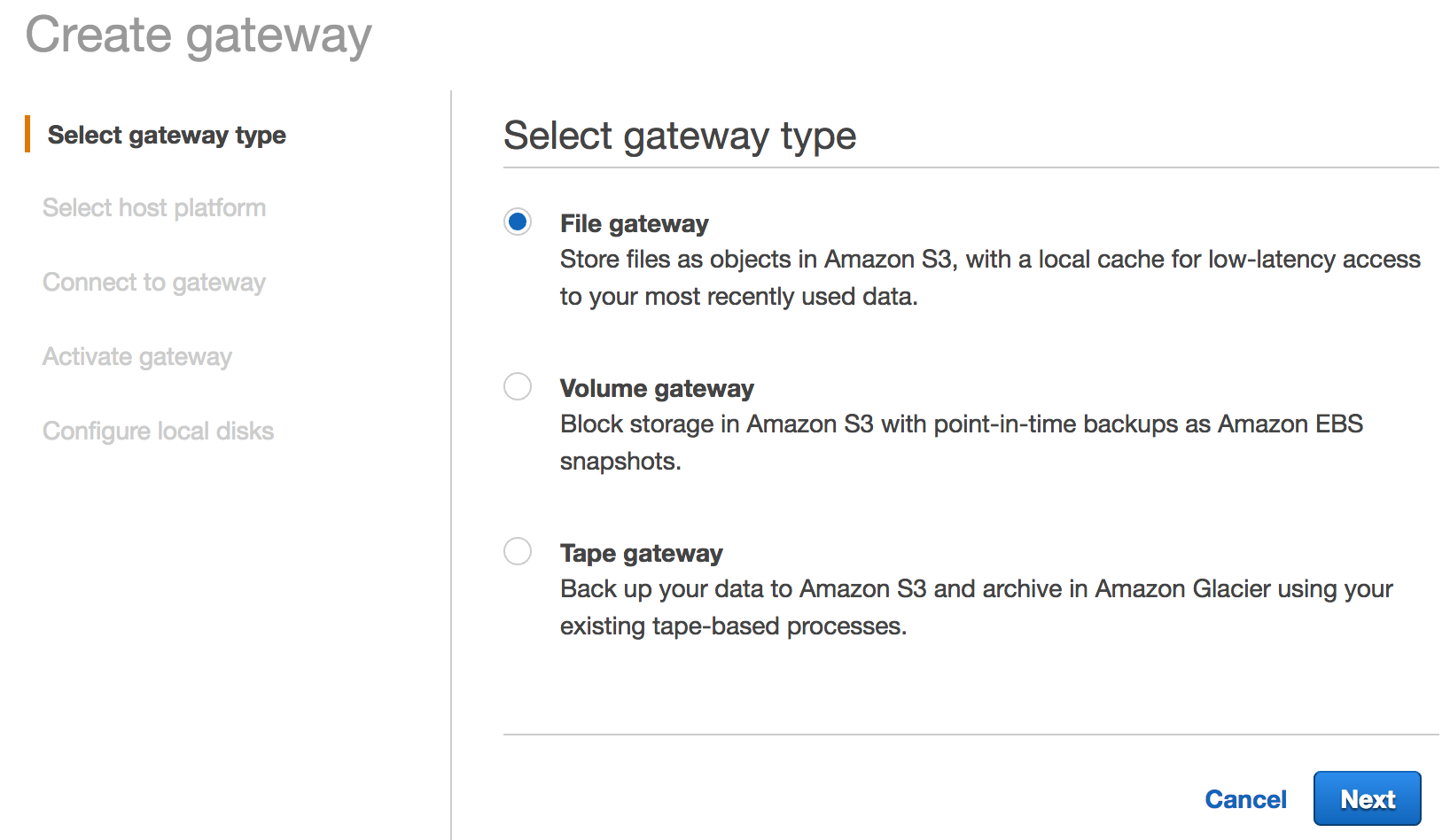 On the wizard screen, select the gateway type. I’ve selected “File gateway” but you can also do Volume gateway for block devices, and Tape gateway for a tape library. Click Next.
