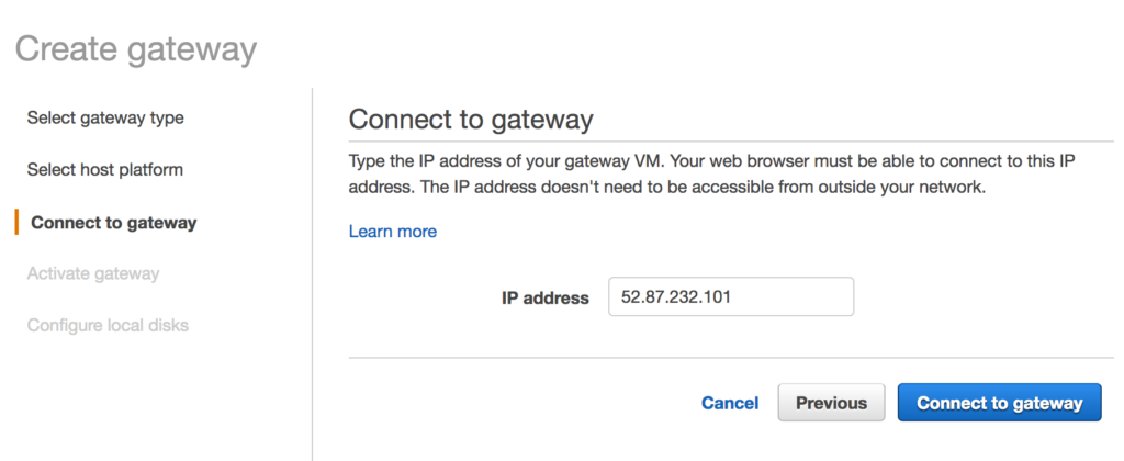 Once the EC2 instance has had time to spin up, we can go back to our storage gateway wizard where we jumped out of to create our EC2 instance. Enter in the IP Address of the new EC2 instance. I used the public IP Address but you could use a private IP if you have connectivity from your workstation to the storage gateway. Clicking the “Connect to gateway” button just redirects your browser to activate the gateway.