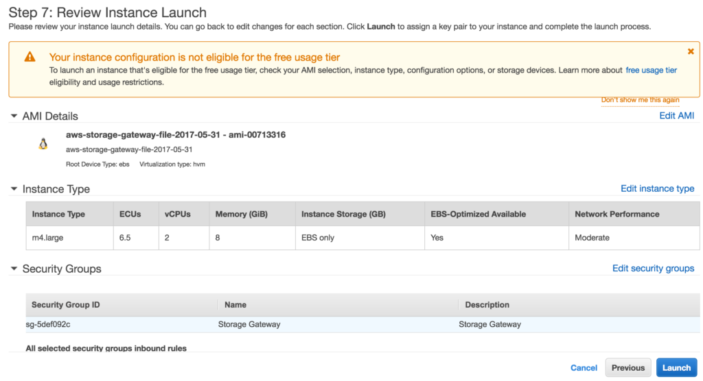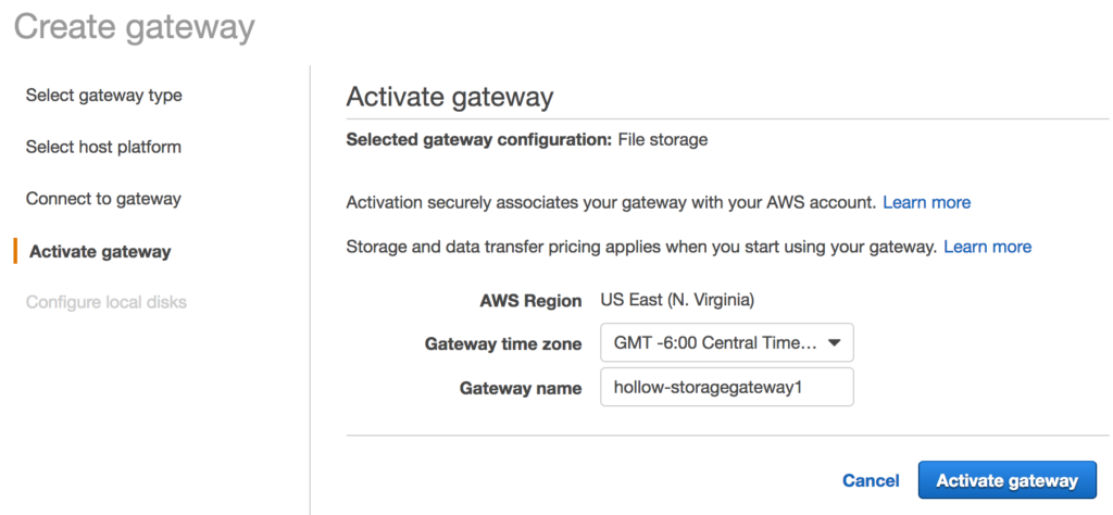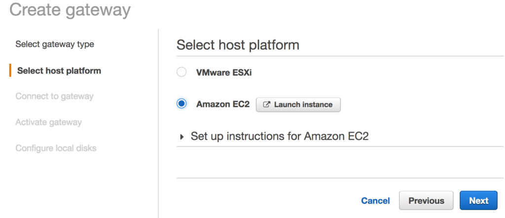 On the host platform select where you’ll place the storage gateway. You can download an OVA for VMware, or spin up an EC2 instance. For this post I used the EC2 instance. Click the “Launch instance” button to take you to that wizard.