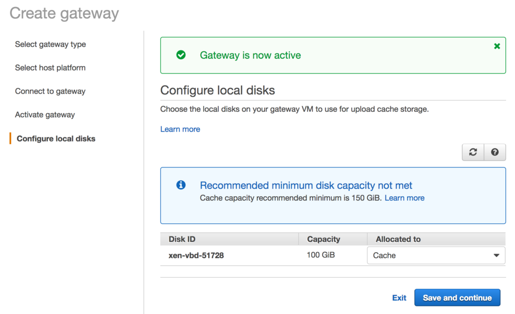 Once you do that the gateway will be active and you need to set your cache. After a moment your spare disk should be recognized and you can allocate it to the “Cache”. Click the Save and Continue button.