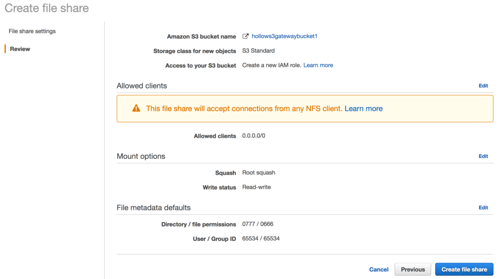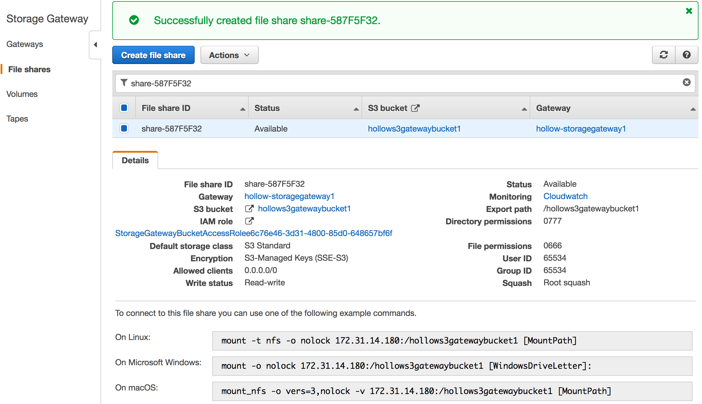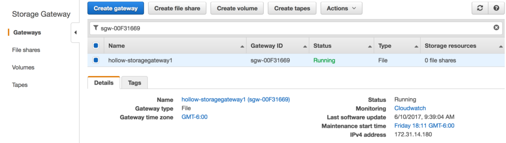 Now that gateway is deployed and activated, we’ll be taken to our list of storage gateways. You should see a status of running. Click the “Create file share” to add an NFS share.