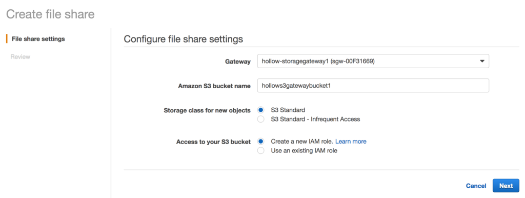 The gateway should be set already, but if you have multiple gateways, select the correct one. Then enter in the name of the S3 bucket we created at the beginning of this post. Don’t make the mistake of thinking that this wizard will create an S3 bucket for you. It won’t. Then select the storage class for new objects and you can leave the “Create a new IAM role” selected so that the permissions are automatically set correctly. Click next.
