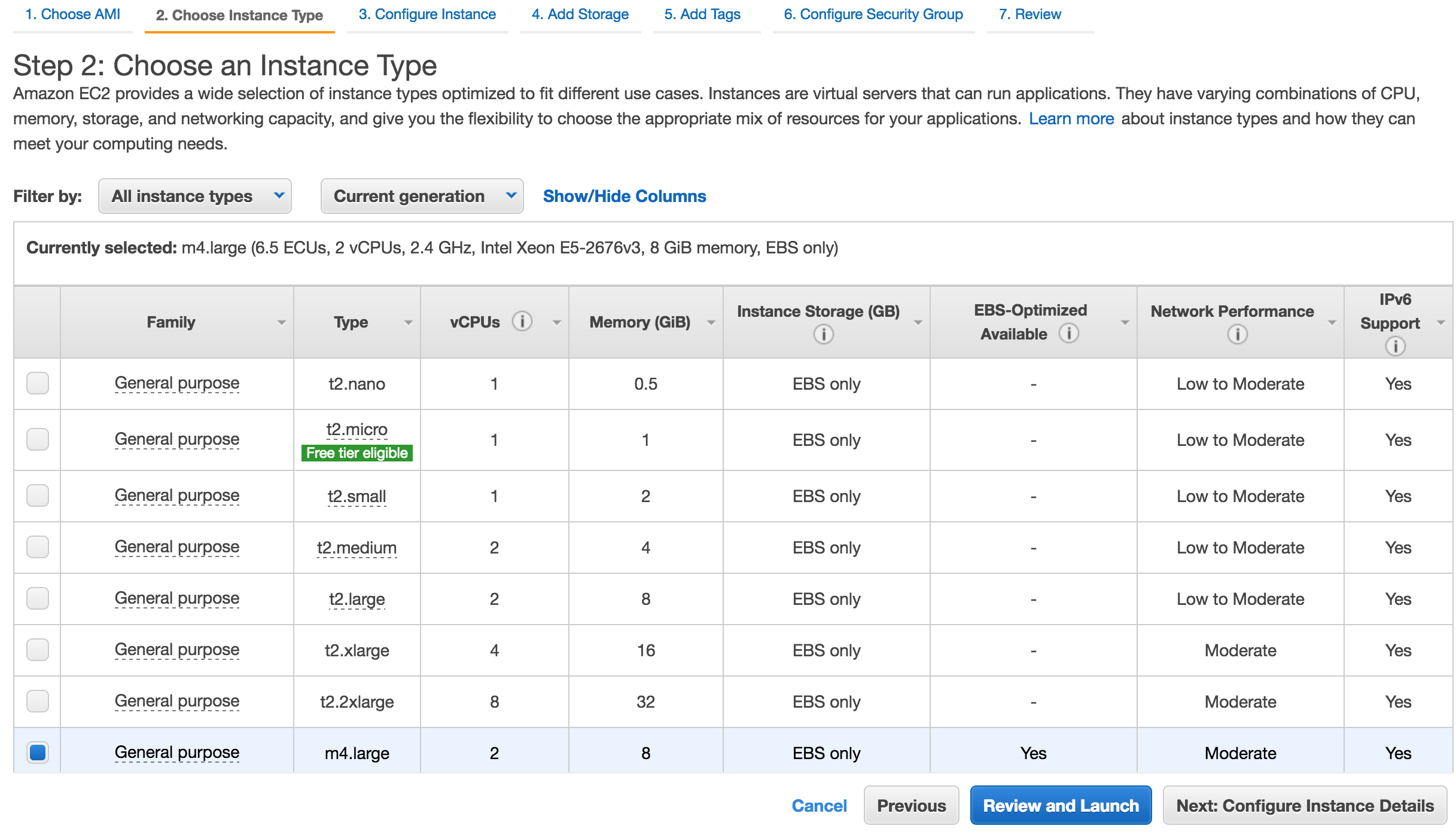 Now we walk through setting up an EC2 instance. The recommended starting size is m4.large but you can select what makes sense for your environment. Click Next.
