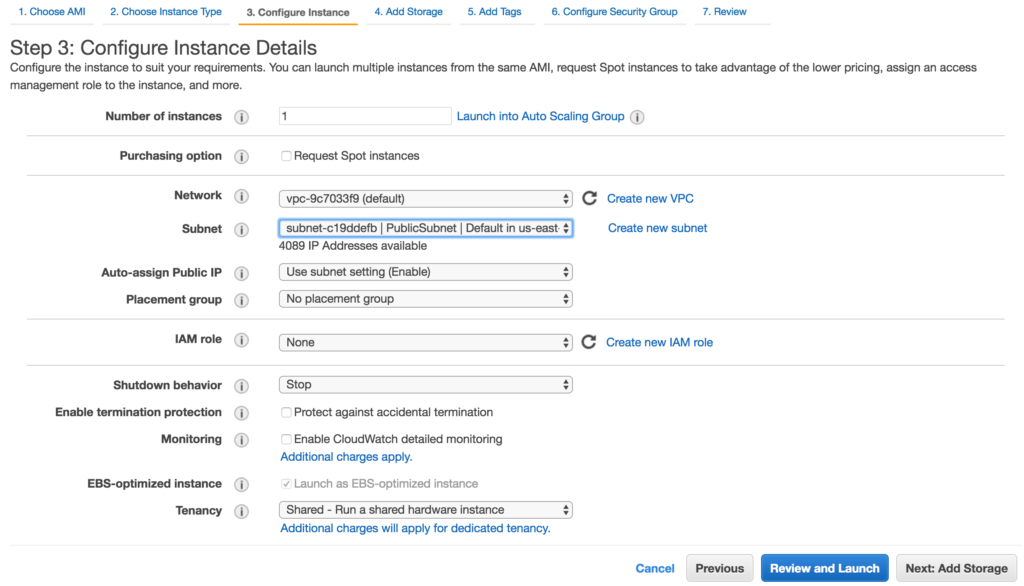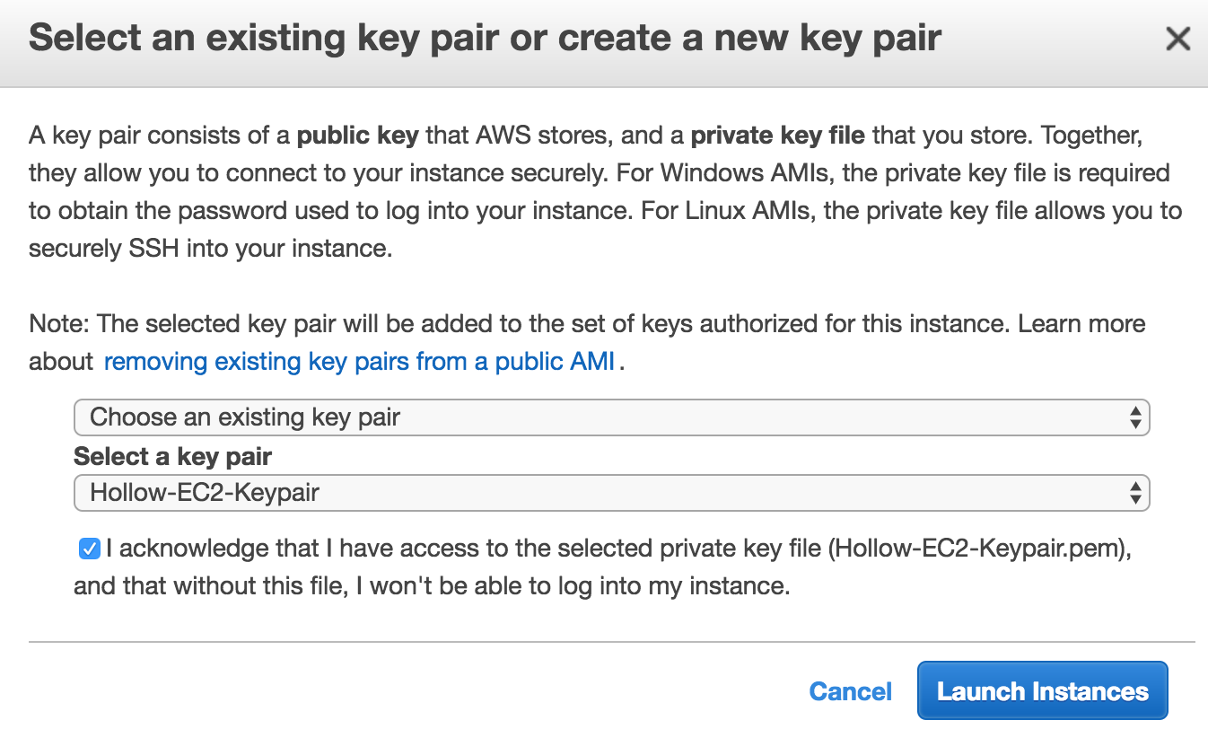Select a keypair in case you need to SSH into the box later. We can’t really SSH in at this point because we didn’t open the SSH port on the security group, but maybe we’d change that later for troubleshooting purposes.