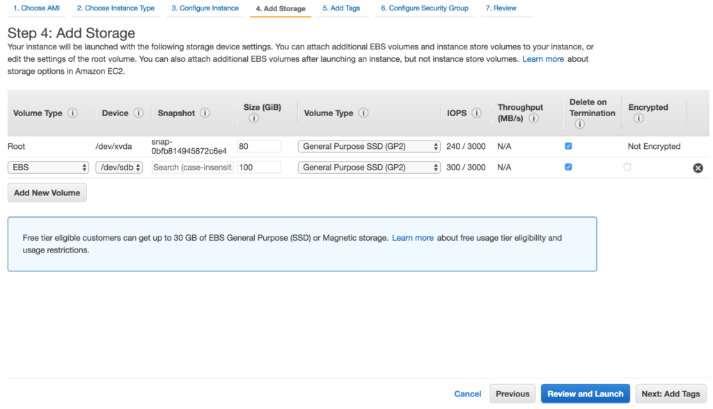 On the storage page, add a new EBS volume for your caching. I used a 100 GB drive but this all depends on how much data you want to cache for your S3 bucket. Obviously, the larger the drive, the more data you can cache for the S3 bucket, but that comes at the cost of EBS storage.