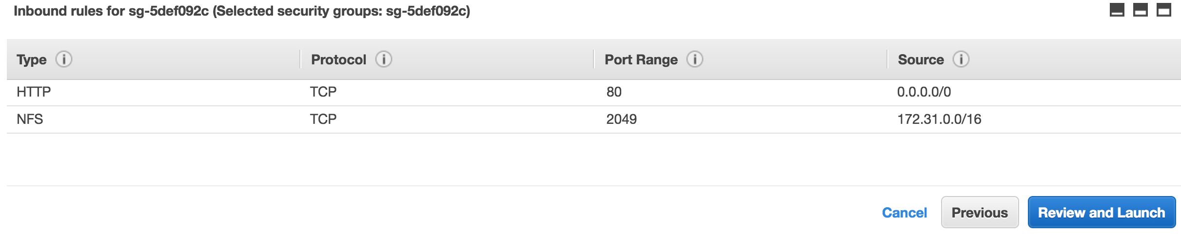 On the security group screen select an existing security group and pick the one we created earlier. You can review our rules again below.
