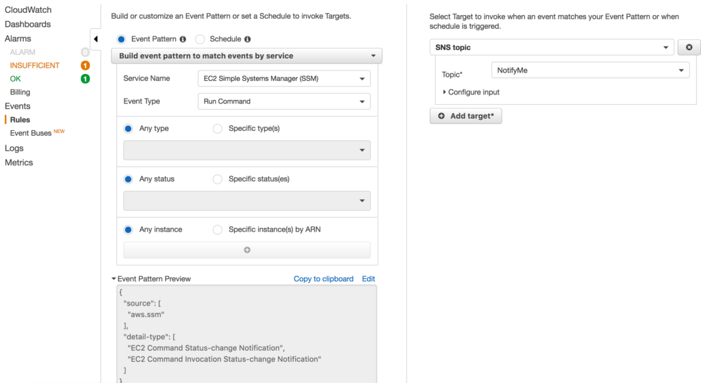 If we want to log our commands executed through Systems Manager, we can use CloudWatch Events as well. This is an optional setup task but useful for enterprise deployments. To get started go to the CloudWatch service and create a new rule under Events. In the service name select the EC2 Simple Systems Manager (SSM) and then under type select which event type you want to alert on. I selected just Run Command but you can pick whatever you’d like. In the Targets section I have selected a Simple Notification Services topic named “NotifyMe” which I setup previously.