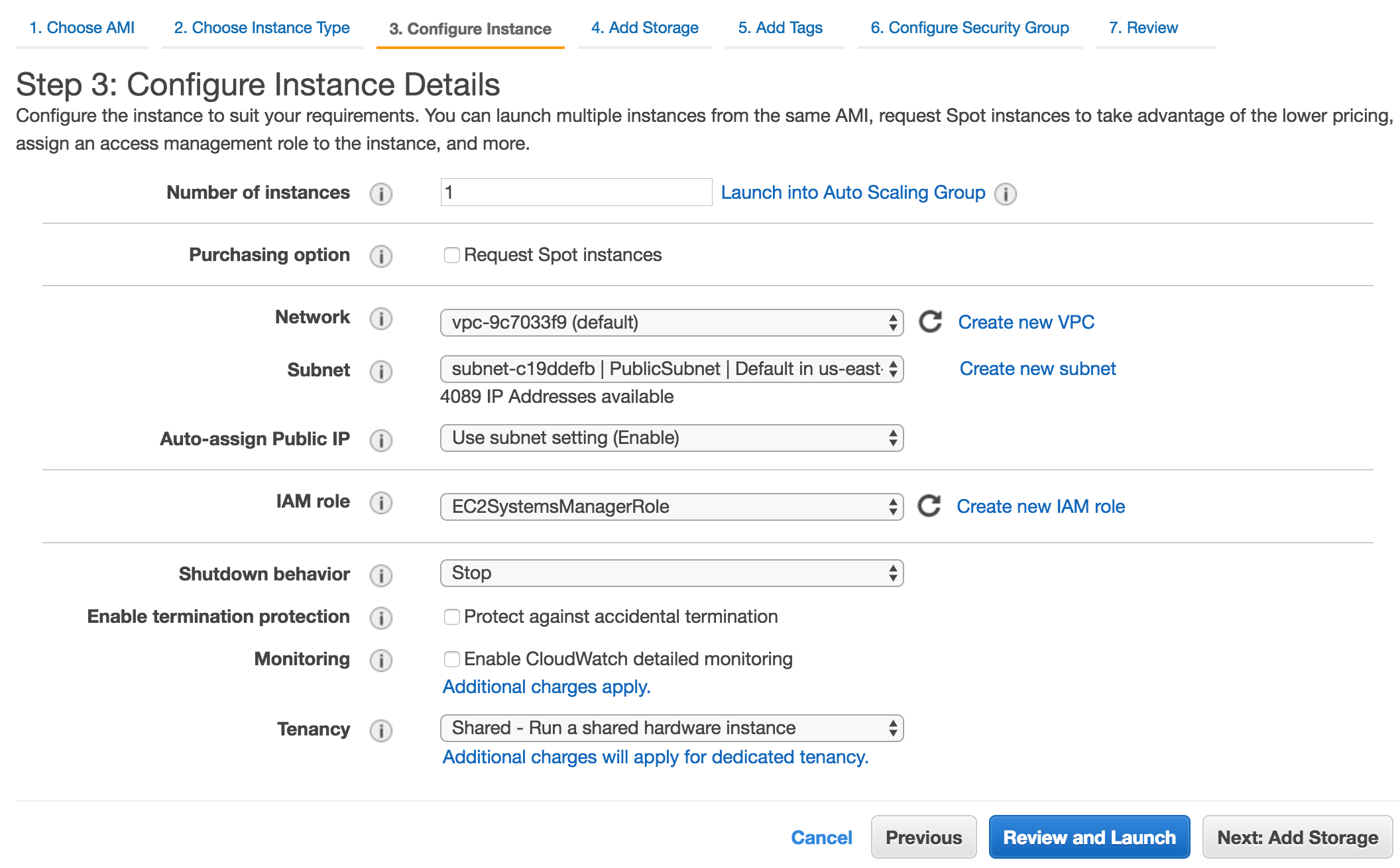 We’ve got things ready to go but we’ll need some test instances to manage. Go to the EC2 instances page and select a supported server type from the list. I’ll choose the Amazon Linux AMI for this example. We’ll want to do the standard things for deploying an EC2 instance such as selecting a family and a type. The important steps for working with EC2 Systems Manager are configuring the instance details. On the “Configure Instance” page change the IAM role to the role that we created in the section above. In my case it’s EC2SystemsManagerRole.