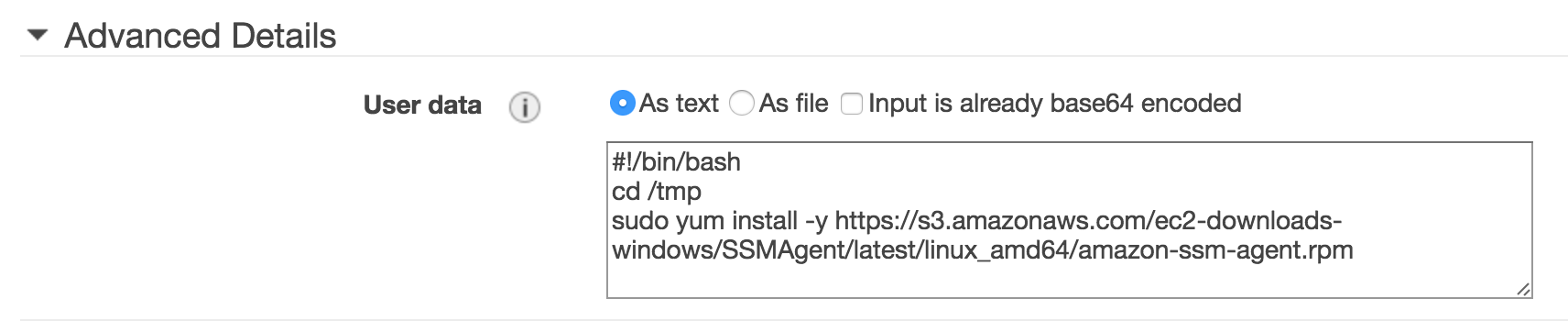 Then further down enter our user data to perform the installation of the SSM Agent during provisioning.