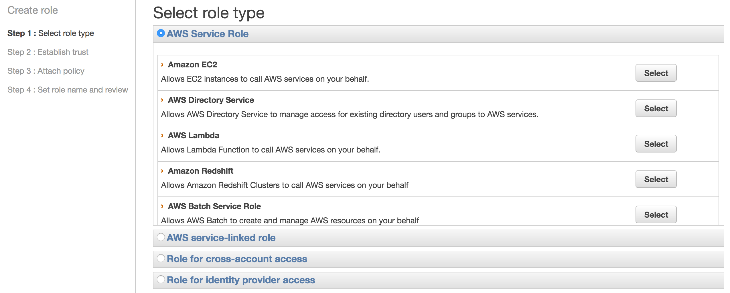 To do that we’ll create a new role through the IAM console. Create a new role and select the Amazon EC2 service role.