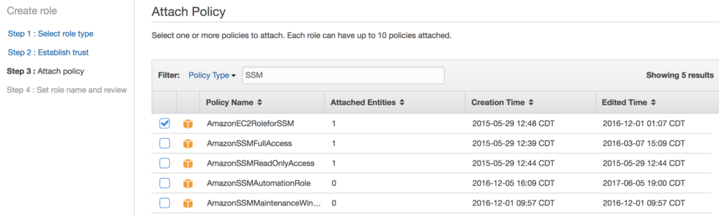 From there type SSM in the policy type to filter down the list and then select the AmazonEC2RoleforSSM in the list.