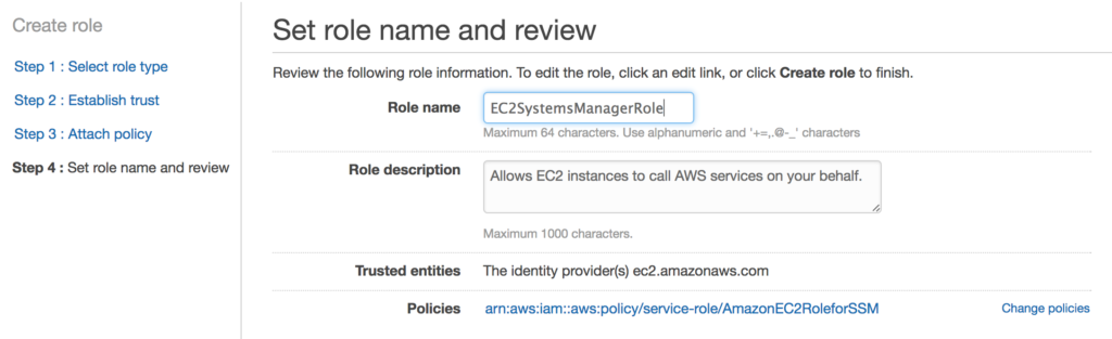 Give the role a name and pay attention to what it is. We’ll use the name again later when spinning up our instances. Click Create Role.