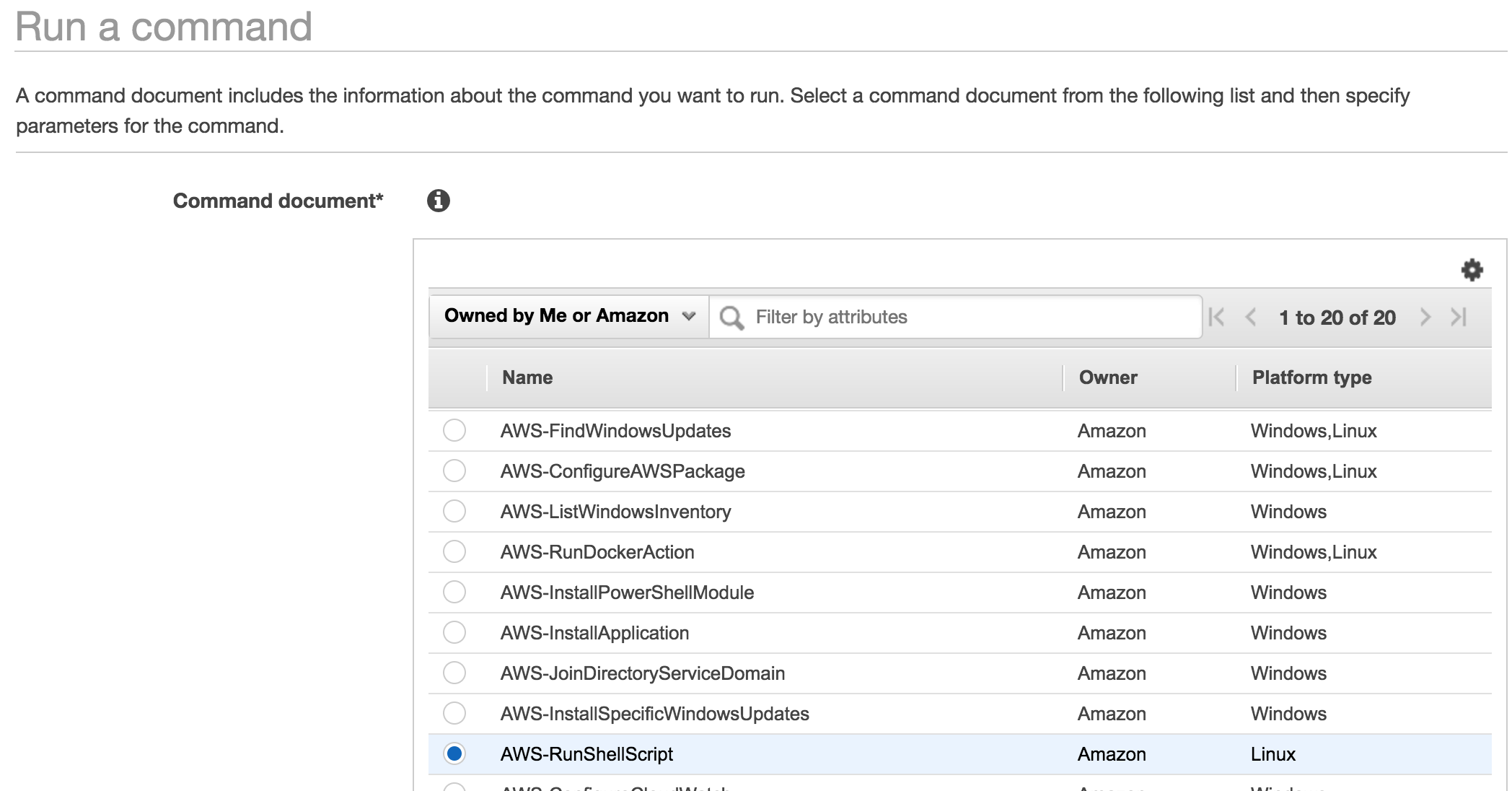 On the Run a command screen, you can see a list of different types of command documents that can be used. Notice that they show you which platform they can be run on where some are Windows only, some are Linux only and some run on both. This screen will let you run docker commands, deploy packages, install updates and run scripts like we’ll do. I picked the AWS-RunShellScript for my machine.