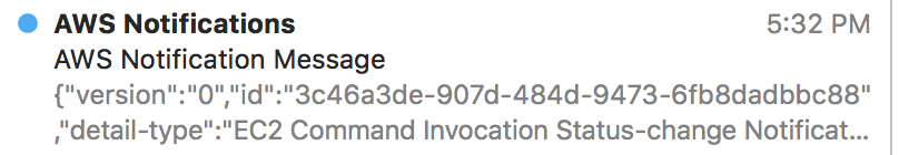 If you’ve been following along since the initial setup post, you’ll also remember that I setup CloudWatch Events for the Run Command that pushed the info to an SNS topic that notifies me via email. I got an email with the details in it as well. This was an optional setup task.