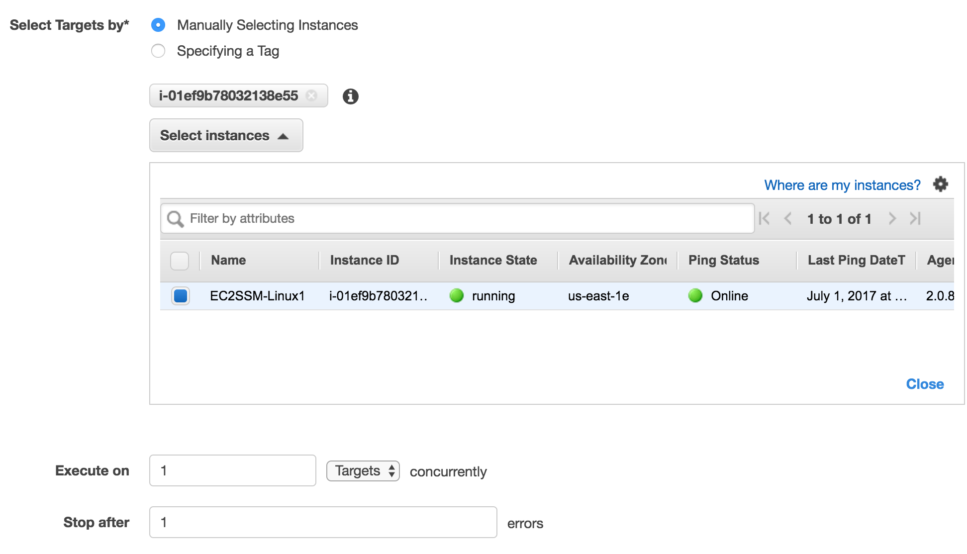 Next, we need to specify which instance this command will run on. This is really nice because you can select an instance manually or by tags. You can see already how easy it is to manage multiple machines in this manner. We could deploy Apache on 50 servers all with a “Web” tag if we wanted to. For the purposes of this example though, a single instance will do so I’ll select my EC2-SSM-Linux1 instance. Note that you can also specify how many instances to run this command on at a time or a percentage and you can specify a number of errors to stop the process after.