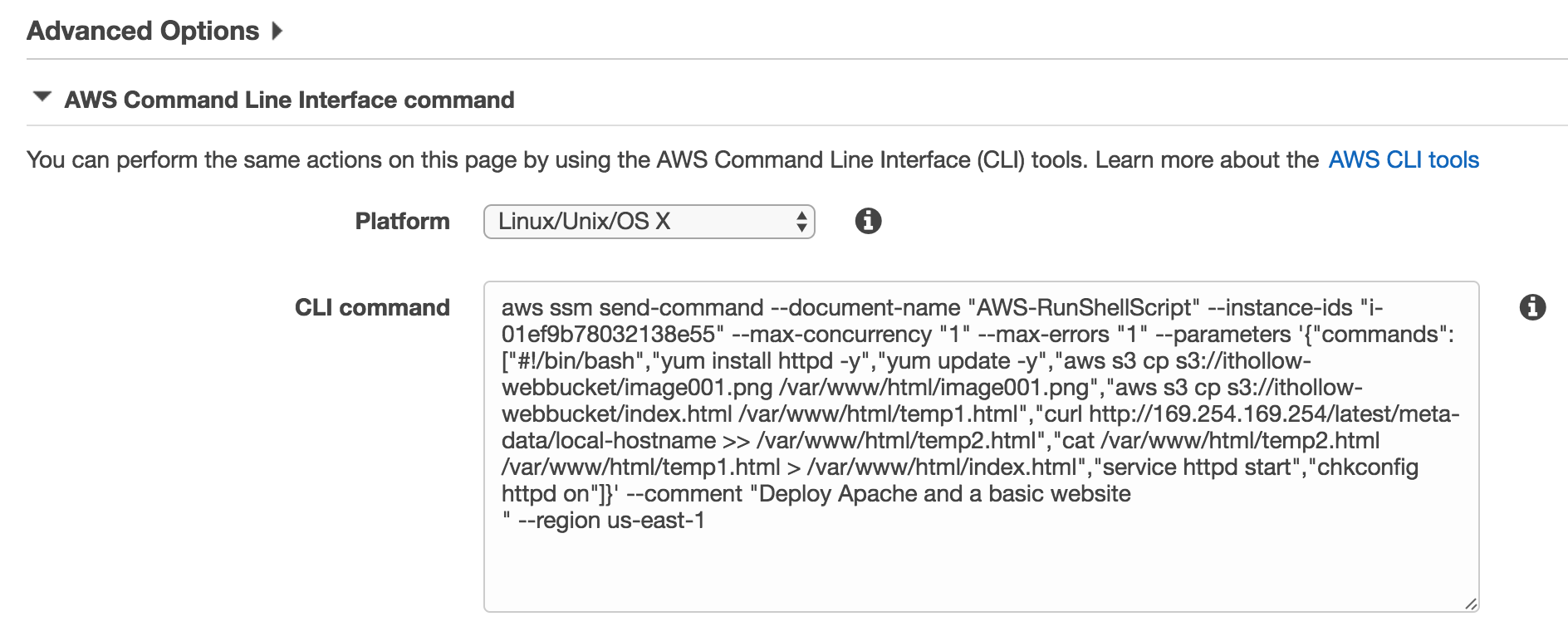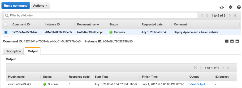 In the command window I’ve entered some commands that installs Apache and downloads my very basic web files before starting the apache service. Lastly I added a comment for the command so I can identity it in the Run Command console.