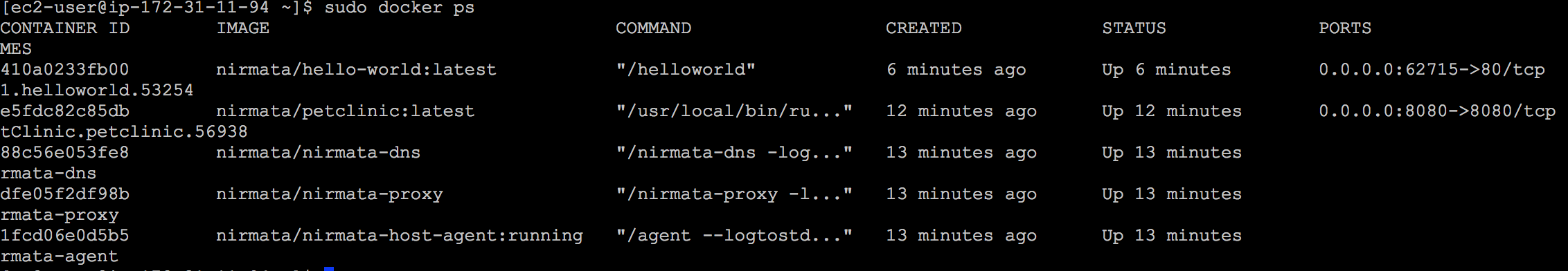 The initial wizard will get you started where you setup some hosts and policies and you’re ready to rock. I’m not a docker expert but even I was able to get it running within a few minutes with some EC2 instances. I used the Nirmata console to deploy a couple of basic containers in my environment, and then logged into one of my instances to see what happened. I have my two test containers along with some Nirmata containers that are used to manage the environment.